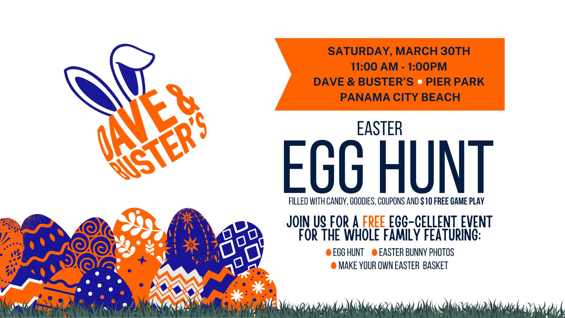 HOP on over to Dave & Buster’s in Pier Park on Saturday, March 30th from 11:00 am- 1:00PM for a FREE Easter Egg Hunt including make your own Easter Basket craft and pictures with the Easter Bunny. Find the lucky eggs for FREE $10 in game play!!!