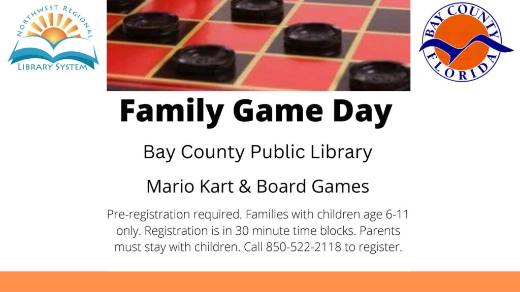 Bay County Public Library 898 W 11th St., Panama City, FL, United StatesMario Kart & Board Games Pre-registration required. Families with children age 6 – 11 only. Registration is in 30 minute time blocks. Parents must stay with children. Call 850-522-2118 to register.